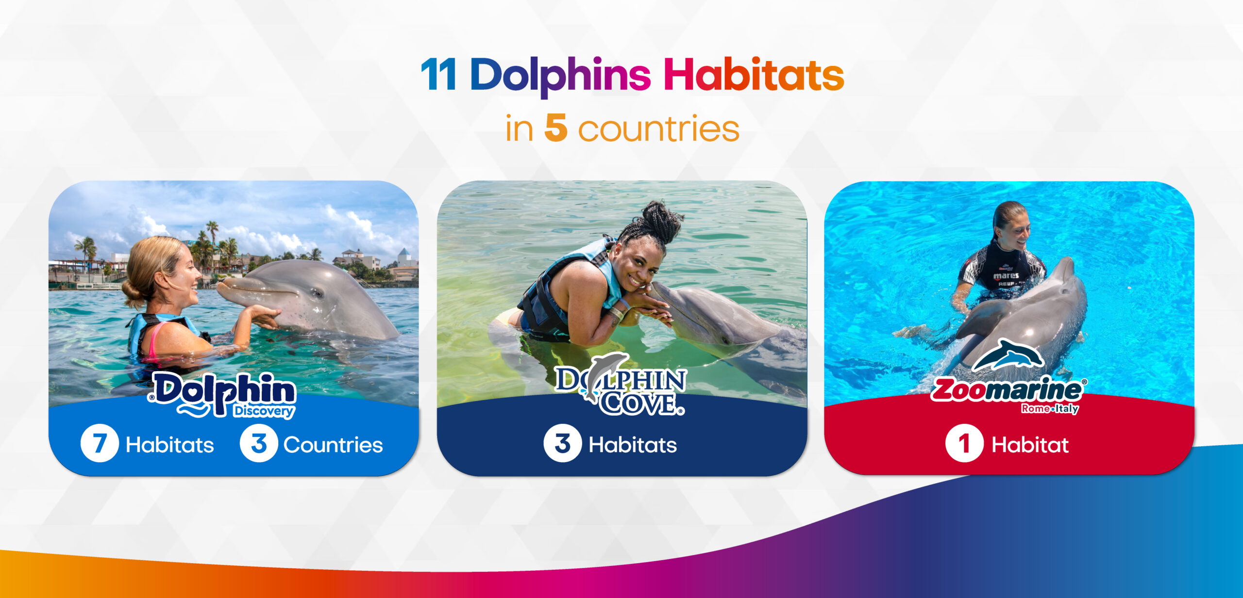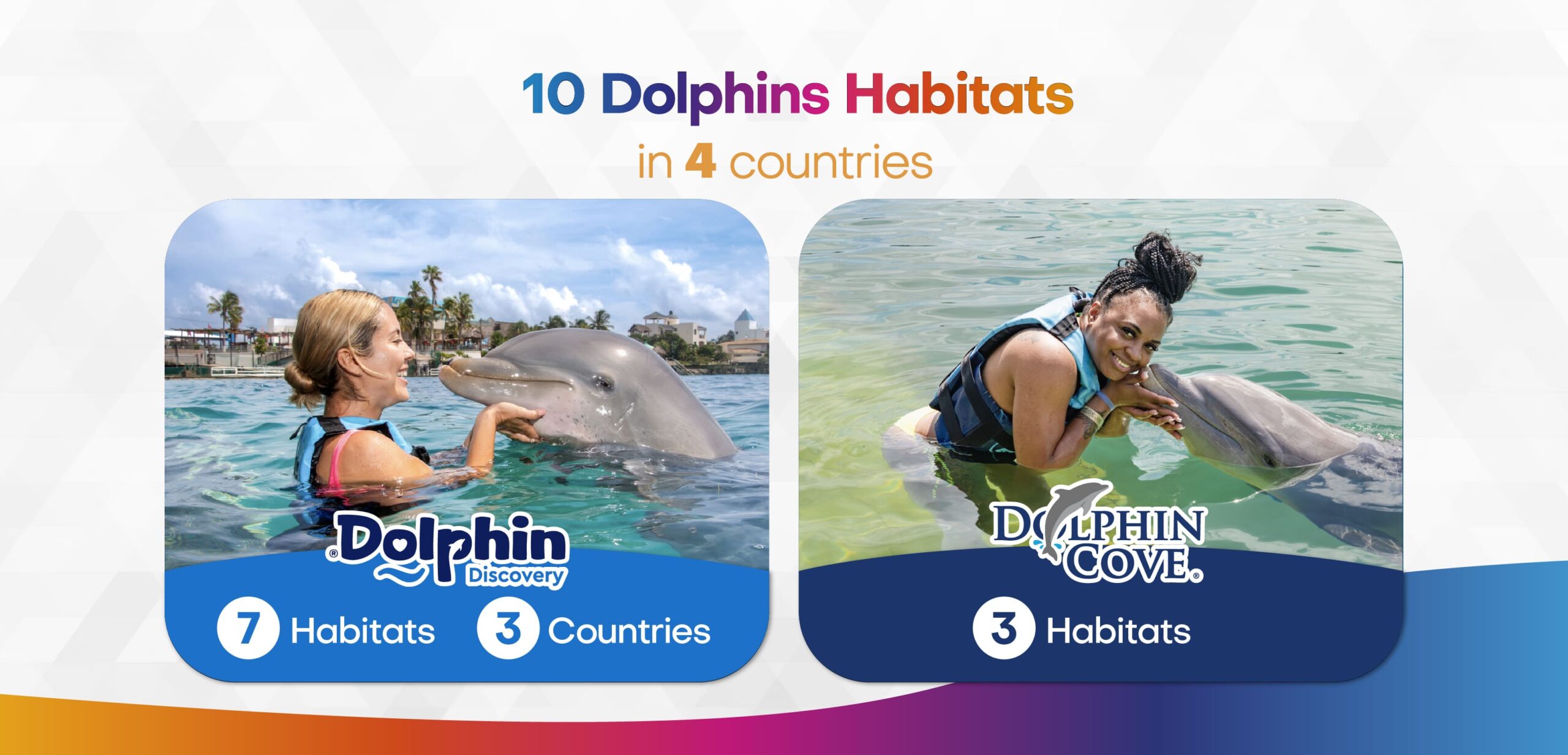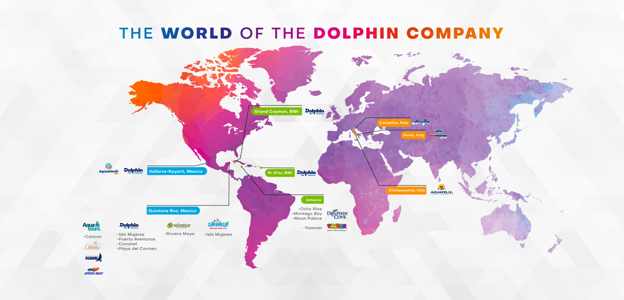 The Dolphin Company incorporates 30 venues, including Nature Parks, Water Parks, Theme Parks, and Dolphin Habitats in 8 countries and 2 continents around the world with facilities in the United States, Mexico, Argentina, the Caribbean Islands, and Italy.