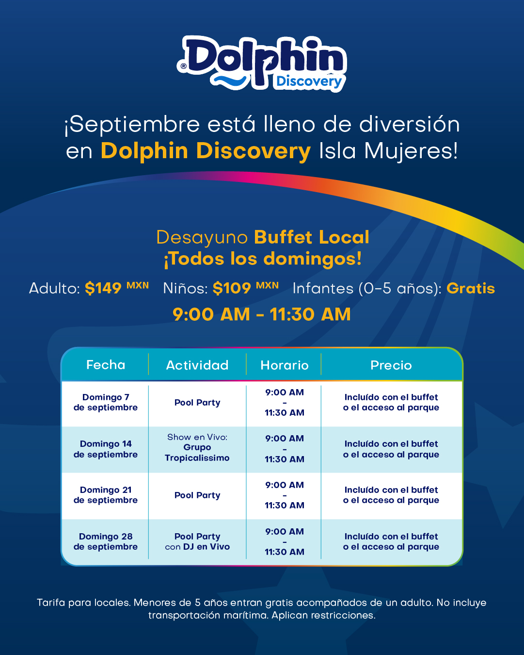 At The Dolphin Company, we are proud to commemorate Independence Month by offering a special program at Dolphin Discovery Isla Mujeres and Parque Garrafón, designed especially for local families. Throughout September, both parks will feature Sunday buffet breakfasts, live music, and pool parties with DJs and recreational activities for all ages.
