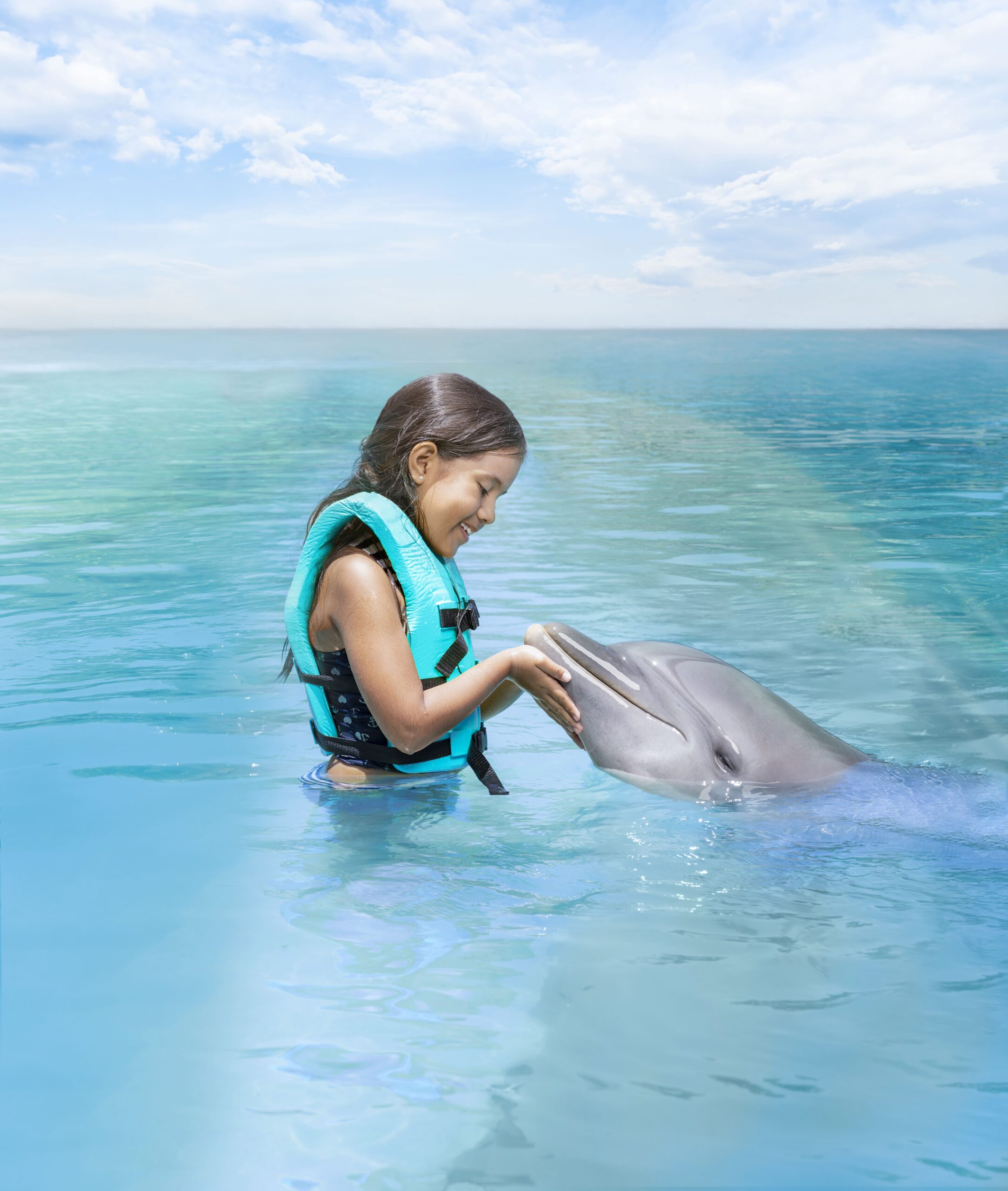 Dolphin Encounter is a unique experience, ideal for all ages. Participants interact with dolphins from a platform with water at waist level, enjoying a relaxed setting that invites understanding of their nature and behavior. Dolphin Connection awakens your five senses to immerse you in a fascinating world, offering a sensory journey that combines physical contact, close observation, and moments that allow you to feel their heartbeat and perceive their way of communicating, generating an authentic and memorable bond. Finally, Dolphin Royal Connection takes the experience even further, creating inspiring and emotional moments through exclusive and personalized interactions that strengthen the intimate bond via individual connection time with the dolphins.